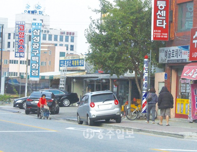 홍성여중 사거리 한솔마트 옆 인도에는 차량들이 일렬로 주차되어 있어 마치 주차장인 듯 한 착각이 들었다. 홍성교(광천통다리)와 홍주고등학교 구간 인도에 주차된 차들로 인해 보행자들은 걸어 다닐 틈조차 없다. 보행자가 차도로 내몰린 채 통행해야 되는 주객이 전도된 상황을 목격할 수 있었다.