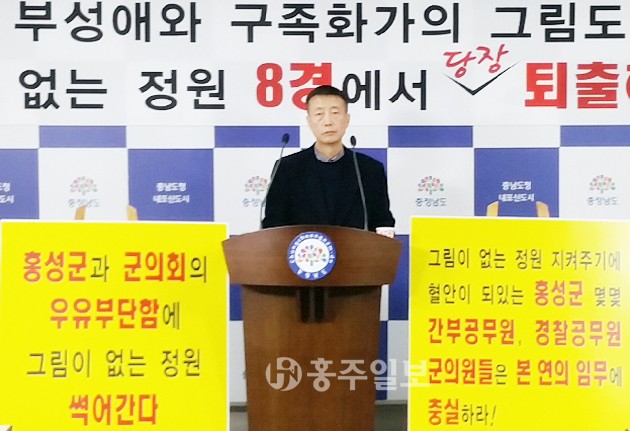 홍성8경 중 4경인 ‘그림이 있는 정원’의 현 소유주를 홍성군이 감싸고 돈다는 비판이 제기됐다. ‘임형재 화백 후원회’는 지난 3일 도청 브리핑룸에서 기자회견<사진>을 열고 “군이 홍성8경 존치에 대한 부정적인 여론조사결과에도 불구하고 찬반이 분분하다는 이유로 홍성8경 심의위원회를 무기한 연기하는 등 사유재산을 지켜주려는 것으로 의심할 수밖에 없다”며 “8경에서 제외하고 모든 지원을 중단하라”고 주장했다.