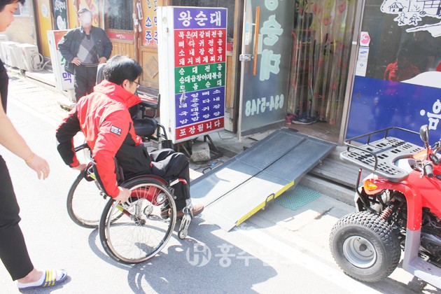 실제로 홍성군청 맞은편에 위치한 홍주성역사관 앞 인도는 차도와의 높이가 크게 달라 휠체어를 탄 장애인들의 불편을 초래하고 있으며, 차도에서 전동 휠체어가 다니게 되면 사고 위험도 높아 개선 요구의 목소리가 높다. 특히 해당 인도 주변에 있는 군청과 읍사무소 등 관공서 이용에 장애인이 큰 불편을 겪고 있다. 윤 팀장에 따르면, 군청이나 읍사무소는 수 년 전부터 장애인의 편의를 위해 시설을 개선하는 등 노력을 계속해왔으나 읍면에 위치한 단위농협이나 우체국, 보건지소 등은 아직도 열악한 상황이다. 또 윤 팀장은 “읍면에 위치한 기관 장애인 화장실에는 청소도구나 휴지 같은 물건을 쌓아두는 경우도 많아 제대로 이용하기 어렵다는 장애인들의 하소연도 이어지고 있다”고 밝혔다.