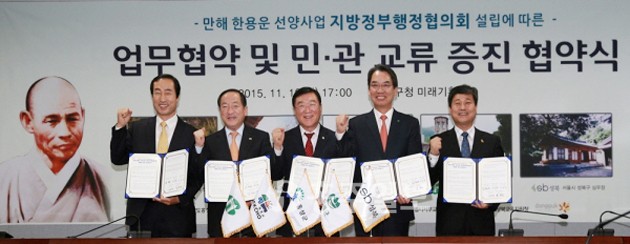 홍성군을 비롯해 속초시, 인제군, 성북구청과 서대문구 등 5개 지자체는 지난 16일, 성북구청에서 ‘만해 한용운 선양사업 지방정부행정협의회(이하 협의회) 설립을 위한 업무협약을 체결했다. 이번 협약에는 동국대 만해연구소와 5개 지자체의 교육지원청도 함께 참여했다.