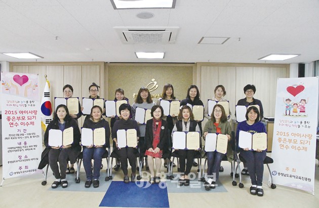 충청남도유아교육진흥원(원장 장진옥)은 9월 24일부터 지난 12일까지 총 8주차로 충남 도내 만3~5세 유치원 학부모를 대상으로 2015 아이사랑 ‘좋은 부모 되기 연수 이수제(2기)’를 운영했다. 저작권자 © 홍주일보 무단전재 및 재배포 금지 홍주일보 다른기사 보기 페이스북 카카오톡 URL복사 기사공유하기