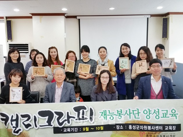 홍성군자원봉사센터(센터장 이동춘)는 전문자원봉사자 육성의 일환으로 지난 9월부터 진행한 캘리그라피 재능봉사단 양성교육 수료식을 지난 6일 센터 교육실에서 가졌다. 저작권자 © 홍주일보 무단전재 및 재배포 금지 홍주일보 다른기사 보기 페이스북 카카오톡 URL복사 기사공유하기