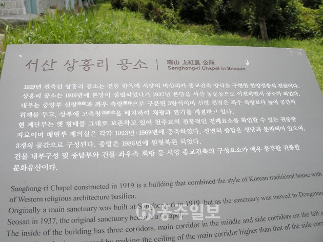상홍리 공소는 서산시 음암면 상홍리에 있으며 과거에는 ‘가재공소’라고 불렸다. 가재는 갈재 밑에 있는 마을로, 가래나무가 많았다 하여 그렇게 불렸다고 한다. 이 마을에 공소가 세워진 것은 적어도 1884년 이전의 일이었다. 1880년대 초, 충청도의 중앙과 서부지역을 담당하던 두세(Doucet, 丁加彌, 1853~1917) 신부의 1883~1884년도 교세 통계표에서 가재공소를 찾을 수 있다. 하지만 공소 이름만 있을 뿐, 신자 수 등은 기록되어 있지 않다.
