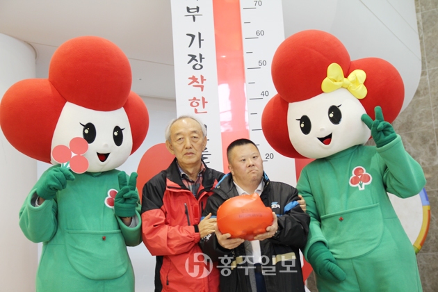 사뭇 진지한 표정으로 자신의 감정을 전달하는 양주만 씨의 말이다. 양 씨는 지난 23일 홍성군장애인종합복지관 직원들과 함께 충남도청을 찾았다. 충남사회복지공동모금회에 살뜰하게 모은 돈이 가득 담긴 돼지저금통을 전달하기 위해서다. 복지관 직원들은 동전을 모아뒀다가 양 씨가 저금통을 가져오면 함께 넣어가며 배룰 불려왔다. 해맑은 웃음과 함께 일명 ‘꿀꿀이’라 부르는 돼지 저금통을 전달하는 것은 6년째 변함없는 양 씨의 행복한 행보 중 하나가 됐다.