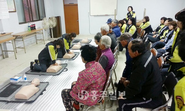 지난 18일 홍성읍여성의용소방대 20여명은 월산리 1구 마을회관을 방문해 주민들을 상대로 심폐소생술 교육 및 응급처치 교육을 실시하며 본격적인 119수호천사 활동을 시작했다. <사진>