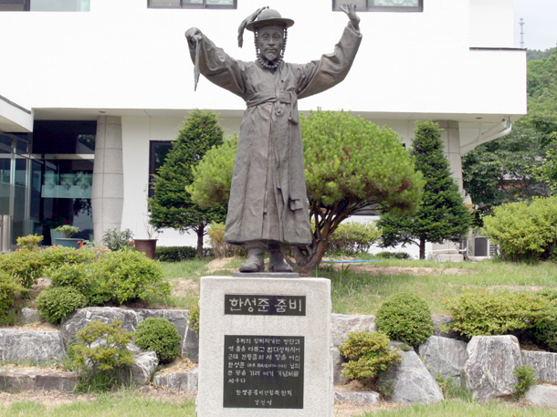 홍성에 세웠다는 한성준춤 비를 보면서 왜 이렇게 빈약하게 만들었을까 하는 생각에 선생님께 죄스러웠다. 그래서 우리 전수관 앞에 선생님 동상을 다시 세웠다. 선생님의 훈련무 동작이다. 당시 훈련무 하시던 사진이 있기 때문에 똑같이 했다.