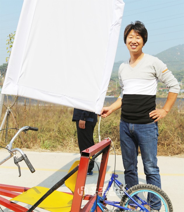 이날 홍북면 상하리 용봉산생태하천 인근에 위치한 풀뿌리상상놀이체험장에서 열린 ‘바람피고 바람타기 좋은 날’행사는 바람자전거가 일반인에게 처음으로 선보이는 자리다. 바람자전거는 홍성군농업기술센터에서 주관한 ‘2015년도 농촌다움 생생아이디어 공모’에서 우수작으로 당선된 아이디어다. 김 씨는 “무심코 지나칠 수 있는 바람도 에너지로 쓸 수 있다는 것을 아이들이 쉽게 이해했으면 하는 생각에 바람자전거 제작하게 됐다”고 말했다.