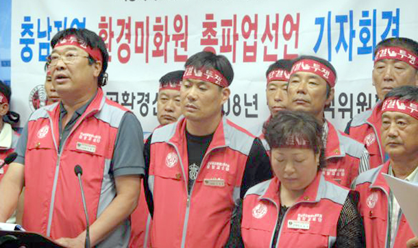 충남도내 9개 시·군 환경미화원 450여명이 참여하고 있는 충남환경노조는 이날 충남도청 기자실에서 기자회견을 갖고 “노사간 교섭이 결렬됨에 따라 내달 2일 총파업 출정식을 갖고, 무기한 파업에 들어간다”며 이같이 말했다.