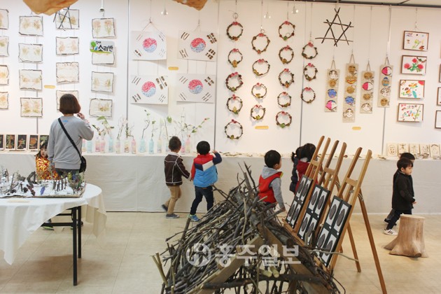 이번 미술제는 원아들이 평소 교사들과 함께 산을 오르는 등 자연체험 활동을 하며 얻은 낙엽, 솔방울, 도토리 등 다양한 재료들을 활용해 손수 만든 작품을 전시한 전시회로 학부모를 비롯해 지역민들의 큰 관심과 호응을 얻었다.