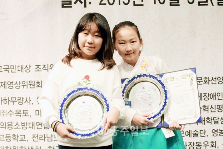 홍남초등학교 구지애(6년·사진 왼쪽) 양이 2015 대한민국 최고 국민대상 시상식에서 사회봉사공로대상을 수상했다.