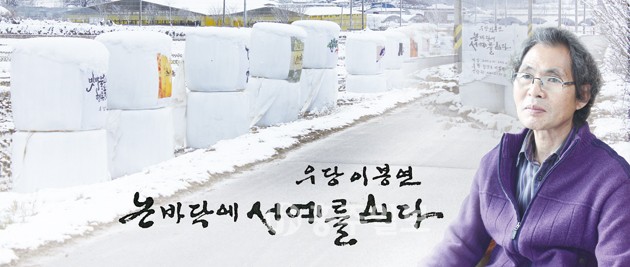 추수를 앞둔 가을들녘은 황금물결이 일렁이는 모습으로 장관을 이룬다. 그러나 추수가 끝난 후에는 휑한 들판에 흰 비닐로 싸여진 짚단만 덩그러니 놓여 있는 모습을 주변에서 흔히 볼 수 있다. 그런데 이 흰 짚단뭉치들을 활용해 청양군 비봉면의 한 논에서 이색적인 전시를 열고 있는 이가 있어 눈길을 끈다. 전 혜전대학교 교수이자 서예가이기도 한 우당 이봉연 선생이 그 주인공이다.