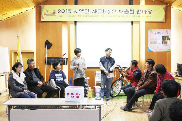 홍성군농업기술센터가 주최하고 홍성군귀농귀촌센터가 주관하는 2015 지역민·새농인(귀농인) 어울림 한마당 ‘톡(talk) 깨놓고, 얘기합시다!’가 지난 5일 홍동면 문당마을 환경농업교육관에서 개최됐다. 이날 어울림 한마당에는 지역민과 새농인 등 200여 명이 한 자리에 모였다. 1부 의식행사와 만찬에 이어 본행사인 2부 토크쇼에서는 지역민과 새농인들이 솔직 담백한 토크쇼와 흥겨운 어울림 행사 등을 통해 서로를 이해하고 화합하는 시간을 가졌다. 귀농한지 12년 된 장곡면 상송리 곽현정 씨는 올해 농업으로 연 500만 원의 소득을 올렸다.