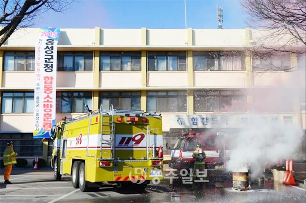 홍성군은 화재 발생시 초기 대응능력 향상을 위해 지난 8일 청사 앞에서 합동 소방훈련을 실시했다.