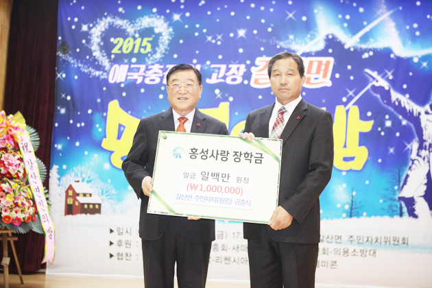 지난 4일 갈산면은 송년의 밤 행사를 가졌다. 특별히 이날 행사에는 나눔이 있는 뜻 깊은 행사가 진행됐다. 바로 갈산면주민자치위원회 공충식 위원장이 홍성사랑장학회에 장학금 100만 원을 기탁한 것. 군수와 국회의원을 비롯해 갈산면 단체장, 면민 등 600여 명이 참석한 이번 행사는 따뜻한 나눔의 손길로 더욱 의미 있는 자리가 됐다.