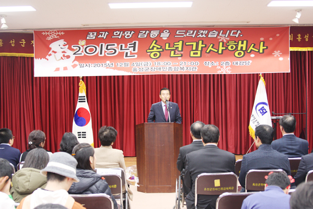 지난 4일 홍성군장애인복지관은 송년감사 행사를 가졌다. 이날 행사에는 부군수, 국회의원을 비롯한 내빈과 복지관 이용자 및 부모, 후원자, 자원봉사자 등 200여 명이 참석했다. 홍성농협주부대학 총동창회와 직원 이주희 씨가 군수 표창을 받았고, 홍주제과기술학원 채선병 씨가 군의회 표창을, 홍성고 2학년 전찬배 군이 교육지원청장 표창을 받았다.