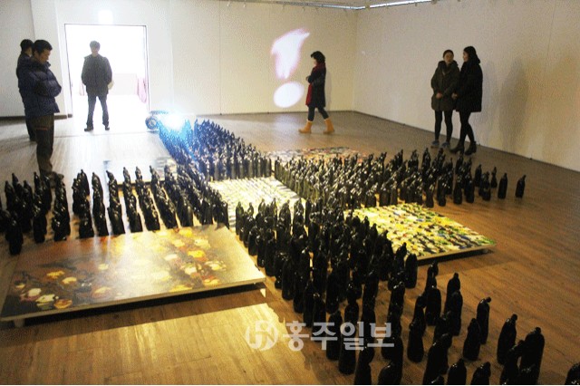 지난 10일부터 14일까지 홍주문화회관에서는 ‘오마주 by 이응노’라는 복합설치미술미디어 전시회가 진행됐다. 주남수 한국미술협회 홍성지부장을 비롯해 이안, 노보성, 김란, 서지명 등의 작가가 참여한 이번 전시회에는 페트병을 활용한 설치예술과 회화, 영상 미디어 등이 어우러져 이응노의 ‘군상’을 형상화했다.