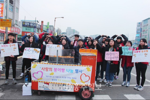 지난 20일 복개주차창 입구에서 따뜻한 행사가 진행됐다. 청로회학생자원봉사단은 독거노인과 장애인들의 후원기금 마련을 위한 ‘사랑의 붕어빵 나눔행사’를 열었다.<사진> 청로회학생자원봉사단 70명은 오전 10시부터 오후 6시까지 조를 편성해 교대로 봉사활동을 펼쳤다. 학생들은 서투른 솜씨지만 사회소외계층을 돕기 위해 정성스럽게 빵을 굽고 직접 만든 피켓을 들고 거리와 상가를 돌아다니며 적극적으로 홍보에 나섰다.