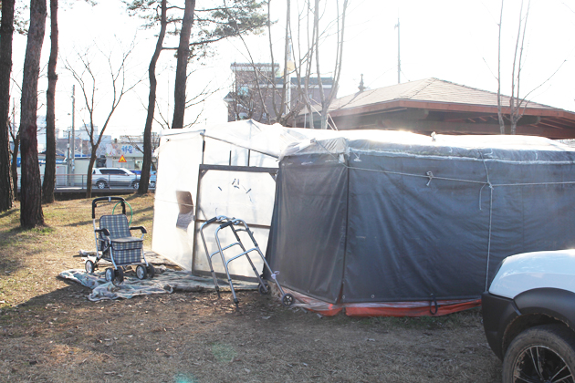 매서운 한파가 몰아치던 지난 8일, 대교공원 한 켠에 마련된 천막 안으로 노인들이 삼삼오오 모여든다. 뒤따라 들어가 보니 난로 하나없이 비닐로 찬기만 간신히 막은 천막 안에 10여명의 노인들이 모여 담소를 나누고 있다. 연령대는 60대부터 90대까지 다양하다. 특별할 것도 없는 이 곳에서 일 평균 40~50여명의 노인들이 무료한 하루의 일상을 보내고 있다. 최고령자인 95세 김사순 할머니는 거동이 불편한 데도 불구하고 매일같이 보행보조기에 의지한 채 이곳을 찾고 있다. 하루 종일 집안에서 지내기 무료한 노인들이 복지관이나 경로당이 아닌 비좁고 추운 천막을 찾는 이유는 무엇인가? 정종화(78·남)씨는 “평생을 틀에 갇혀 짜여진 각본 처럼 살아 온 노인들은 자유로운 삶을 원한다”며 “접근성도 떨어지고 정해진 규칙에 맞춰진 복지관 프로그램을 이용하는데 불편을 느끼는 것 같다”고 말했다. 임재선(69·남) 씨는 “복지관도 배우려는 사람들한테 열려있지 보통은 그냥 찾아 가기 어려운 게 당연하지 않냐”며 “무료한 일상을 달래려 이야기가 통하는 사람들이라도 만나려다보니 공원에 다들 모여드는 것”이라고 말했다. 그렇다면 경로당은 어떠한가? 정종화 씨는 “성비 불균형으로 인해 경로당에 주로 할머니들이 더 많이 모여 있다 보니 남녀칠세부동석과 같은 유교적 교육을 철저하게 받은 세대의 할아버지들은 함께 자리하기가 불편하다”고 말했다. 이상예(74·여) 씨는 “경로당에 가서 화투라도 치려면 돈이 있어야 한다. 노인들 사이에서 돈 없으면 경로당에 가지도 못 하는 것으로 인식되어 있다”고 멋쩍은 듯 웃으신다. 베이비 부머 세대 고영호(61·남) 씨는 “탁 트인 공간에 주변에 운동시설도 갖춰져 있어 노인들이 이곳을 선호하고 있는 것 같다”며 “이제는 노인문제를 노인 계층과 심리에 맞춰 좀 더 심층적으로 접근해야 한다”고 제언했다.