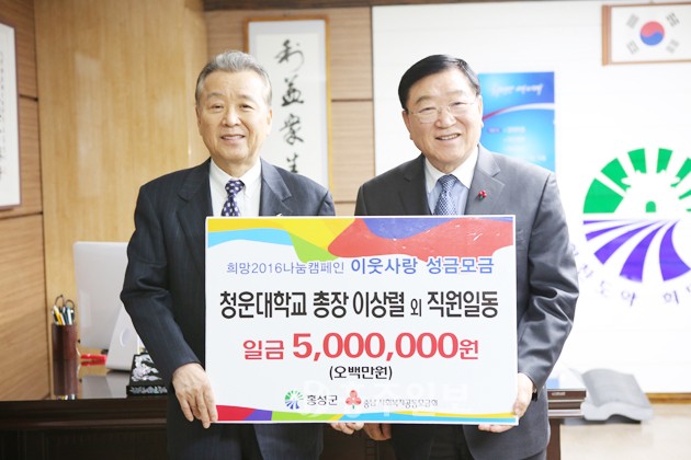 지역대학인 청운대학교가 이웃돕기 성금을 전달해 훈훈함을 더하고 있다. 청운대학교(총장 이상렬)는 지난 12일 홍성군청을 방문해 김석환 군수에게 불우이웃돕기 성금 500만원을 전달했다. 이번 불우이웃돕기 성금은 이상렬 총장을 비롯해 교직원의 기부로 모아진 것이며, 홍성지역의 소외된 이웃들에게 전달하기 위해 마련됐다. 특히 이번 성금은 지역대학과 군이 힘을 모으는 계기가 된 것으로 평가돼 그 의미를 더하고 있으며, 대학과 군간 협력 강화에도 큰 영향을 미칠 것으로 기대되고 있다.