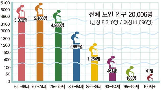 2014년 말 현재 지역 노인인구의 성비구성은 남성 노인이 8310명인데 반해 여성이 1만1696명으로 남성노인보다 여성 노인 인구수가 40.75%로 크게 앞질렀다. 이는 일반적으로 여자가 남자보다 평균수명이 길기 때문인 것으로 우리나라 남녀평균수명은 2013년 기준 남성의 평균수명은 78.5세, 여성은 85.1세로 늘었고, 남녀 평균수명 차이는 6.6세이다.