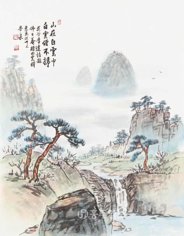 시인은 그곳에서 ‘흰 구름을 쓸지 않는’ 무위(無爲)를 경험한다. 그것은 본래 산이 흰구름 속에 잇는 것과 또한 구름이 산을 감싸고 있음이 서로 다르지 않아서 인위(人爲)를 더할 까닭이 없기 때문이다.