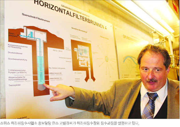 정수장의 정수과정은 의외로 단순했다. 한스 고넬라 씨는 “단 3단계의 정수과정만으로 완벽하게 깨끗한 물을 만들어 낸다. 리마트강과 지하 25m 지점에서 원수를 끌어들임과 동시에 20여m 위로 물을 솟구치게 만드는 수직여과방식이 1차 정수과정이다. 이 과정을 거친 물은 거대한 모래 수조인 2차 모래여과장치를 통과한다. 그리고 마지막으로 수직으로 지하 25m 깊이에서 산소 투입형태로 이루어지는 3차 정수과정인 평형식여과처리 과정을 거치면 스위스가 자랑하는 세계 최고 수질의 수돗물이 된다. 이 세 차례 정수과정에서 염소 등 어떠한 화학물질도 사용하지 않으며 울트라필터라는 특수한 화학물질이 독성 등을 제거하는 역할을 하고 있다”고 말했다.