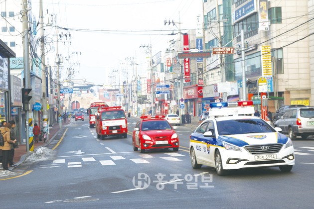 ▲ 홍성소방서(서장 김근제)는 지난달 28일 홍성읍 전통시장 일원에서 ‘골든타임제’ 성공 추진을 위한 소방차량 불시출동훈련 및 소방차 길 터주기 캠페인을 대대적으로 전개했다. 저작권자 © 홍주일보 무단전재 및 재배포 금지 홍주일보 다른기사 보기 페이스북 카카오톡 URL복사 기사공유하기