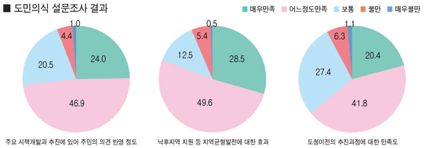 지난 6월16일부터 23일까지 6일간 실시한 민선4기 2년간 도정운영 설문결과, 절대다수의 도민들이 과거 2년전에 비해 도정의 모습, 공무원의 의식과 행태 등에서 많은 긍정적 변화를 가져 왔고, 분야별 도정 주요시책에 대한 긍정적 평가와 함께 국방대 논산이전 등 도정현안 해결이 지역균형발전에 크게 기여한 것으로 평가받았다.
