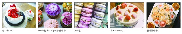 플라워케이크 1호 6만원, 2호 8만원, 3호 10만원, 떡케이크 1호 4만원, 2호 6만원, 3호 8만원, 무지개케이크 1호 3만5000원, 딸기케이크 1만8900원, 마카롱 1600원