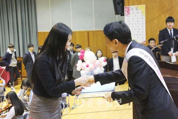 특별한 졸업식을 찾은 학부모들도 굉장히 뜻 깊은 졸업식에 큰 호응을 보였다. 갈산중을 최우수 성적으로 졸업한 오은주 학생의 아버지 오원섭(47) 씨는 “갈산중학교를 졸업한 선배이자 학부모의 입 장에서 갈산중·고등학교가 나날이 발전하고 있다는 생각이 든다”며 “모든 것이 전종현 교장선생님을 비롯한 여러 선생님들의 열정과 노고 덕분”이라고 밝혔다. 이어 “딸아이가 우수한 성적으로 졸업을 해서 홍성지역 진학도 고려를 했지만, 갈산고가 100대 학교 선정 등 앞으로의 발전 가능성이 크다는 생각이 들어 진학을 결정했다”며 “앞으로도 갈산중·고등학교가 명문으로 도약하길 바란다”고 밝혔다.