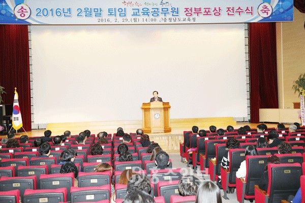 충남도교육청(교육감 김지철)은 지난달 29일 본청 대강당에서 퇴임 교육공무원 및 가족들이 참석한 가 운데 2월말 퇴임 교육공무원에 대한 정부포상 전수식을 가졌다. 이번에 정부포상을 받는 교원은 초등(유, 특수포함) 83명, 중등 94명 등 총 177명이다.
