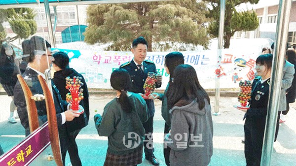 제복차림의 홍성경찰들은 학교 점심시간에 맞춰 구내식당에 깜짝 방문해 직접 준비한 사탕과 초콜릿 을 나눠주며 교우관계에 대한 고민상담의 시간을 가져 교사와 학생들로부터 큰 호응을 얻었다.