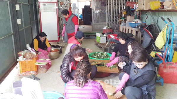 【결성】결성면 여성자율방범대(대장 최경희)는 지난 15일 봄을 맞이해 신선한 채소를 구입하고 홀로 외롭게 보내는 면내 독거노인 27가구에 열무김치를 담가 사랑의 나눔 행사를 실천했다.<사진>