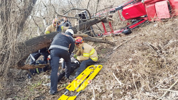 【홍성】홍성소방서(서장 김근제)는 지난 6일 홍성읍 월산리 인근 계곡 쪽에 트랙터가 전복되는 사고가 발생해 신속히 출동한 홍성구조대와 119광역기동단에 의해 운전자 J씨를 구조했다.<사진>