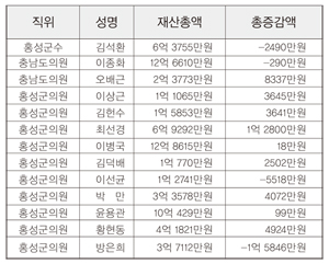 신고내용을 분석한 결과에 따르면 김석환 군수는 지난 한해 2490만원이 감소한 6억 3755만원으로 신고했다. 이는 본인 소유의 대지와 예금이 증가한 반면 배우자 소유 대지의 소유지분 면적 변경신고에 따른 소유권 상실로 재산 감소에 영향을 끼친 것으로 신고했다. 홍성군의회 의원들 중 8명은 총 3억 1701만원의 재산이 증가했고 2명은 총 2억 1364만원의 재산이 감소한 것으로 확인됐다. 군의원들의 총 재산액 합계는 46억 1276만원으로 평균재산 4억 6127만원으로 집계됐다. 충남 시·군의원 평균 재산은 5억 4500만원이다.
