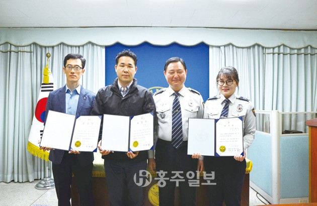 ▲ 홍성경찰서(서장 구재성)는 지난 4일 업무 유공 경찰관인 경비교통과 박종덕 경사, 생활안전과 조송식 경사, 이선주 순경에 대해 표창장을 수여했다. 저작권자 © 홍주일보 무단전재 및 재배포 금지 홍주일보 다른기사 보기 페이스북 카카오톡 URL복사 기사공유하기