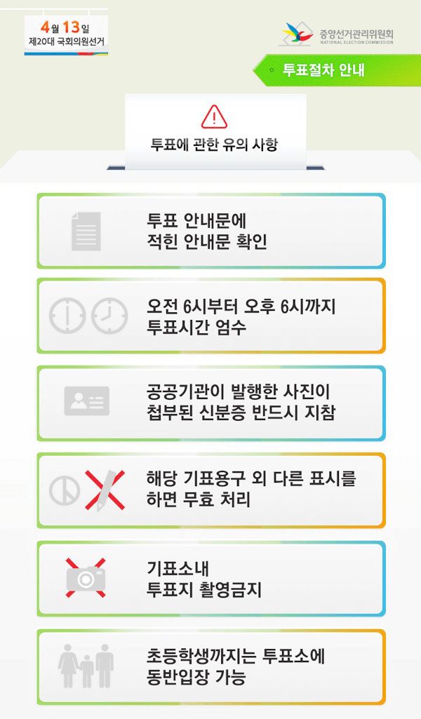 투표에 관한 유의사항으로는 △투표 안내문에 적힌 안내문 확인 △오전 6시부터 오후 6시까지 투표시간 엄수 △공공기관이 발행한 사진이 첩부된 신분증 지참 △해당 기표용구 외 다른 표시를 하면 무효처리 △ 기표소내 투표지 촬영금지 △초등학생까지는 투표소 동반입장 가능 등이 있다.