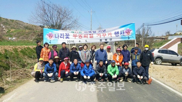 【홍북】홍북면은 제71회 식목일을 맞이해 지난 4일 최영장군 및 성삼문 선생 탄생지인 홍북면 한솔기권 역마을에서 기관단체장, 지역주민, 홍북면 직원 등 50여명이 참석한 가운데 나라꽃 무궁화꽃길 가꾸기 행사를 가졌다.