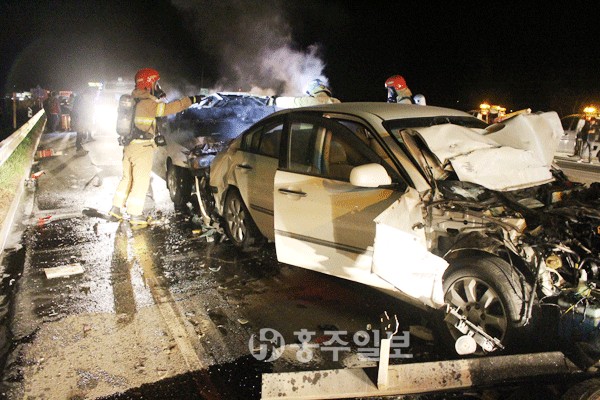 이번 사고는 탑차와 승용차가 신호 대기 중 뒤에서 진행하던 승용차량이 추돌해 일어난 것으로 사고 로 인해 차량화재가 발생했다. 현장에 도착한 홍성구조구급대는 앞 승용차 동승자 이모씨(61세)등 경 상자 3명을 우선 구조해 환자 상태를 파악, 응급처치를 실시하며 신속히 이송했다. 또 소방서 화재진압대는 안전한 환자 응급처지 및 이송을 위해 신속한 화재진압을 실시해 추가 인명피해 없이 사고를 수습했다.