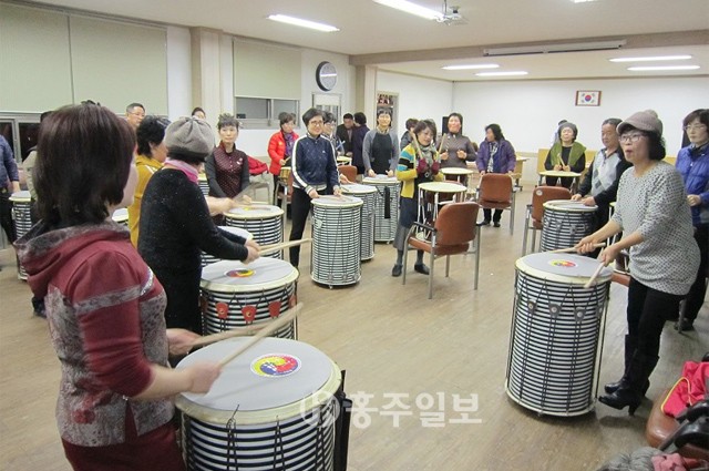 ▲ 갈산면 주민자치센터에서 주민들이 난타를 하고 있다.