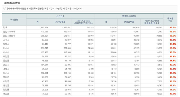 현재 충청남도 전체 투표율은 42.6%를 기록하고 있다.