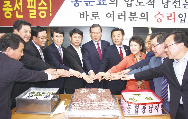 ▲ 홍문표 당선인이 당선축하떡을 지지자들과 함께 자르고있다.