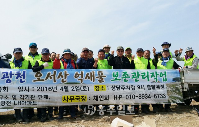 【광천】 광천청록회(회장 강철원)는 지난 2일 오서산 억새풀 보존관리작업을 실시했다. 청록회 회원들과 이용은 주민자치위원장, 최태수 광천읍장, 이경열 이장협의회장, 홍성광천 주공아파트 임원들 80명이 광천 상담주차장에서 9시에 모였다. 회원들은 오서산 정상에 올라 억새풀밭 일대 잡목 제거와 제초작업을 벌였다.