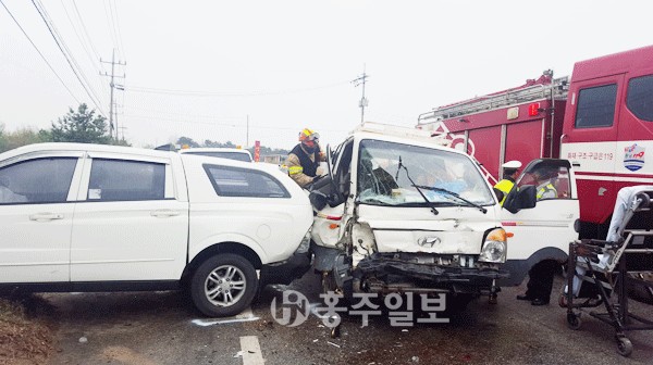 【홍북】홍성소방서(서장 김근제)는 지난 20일 오후 4시경 홍성군 홍북면 봉신리의 D아파트 인근 도 로상에서 발생한 포터차량과 SUV 차량 교통사고에 출동해 경상자 1명을 구조했다.<사진>