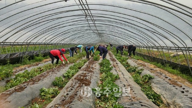 【결성】 홍성군이 본격적 영농철을 맞아 농번기 농촌일손 돕기를 전개해 농민들의 시름을 덜고 있다. 지난달 28일 군 환경과와 결성면 직원들은 농업인구 감소와 고령화로 인력이 부족한 농가의 일손을 덜고, 농촌 현실을 직접 체험하기 위해 결성면 형산리 소재 딸기재배 농가를 찾아 농촌일솝돕기를 실시했다.