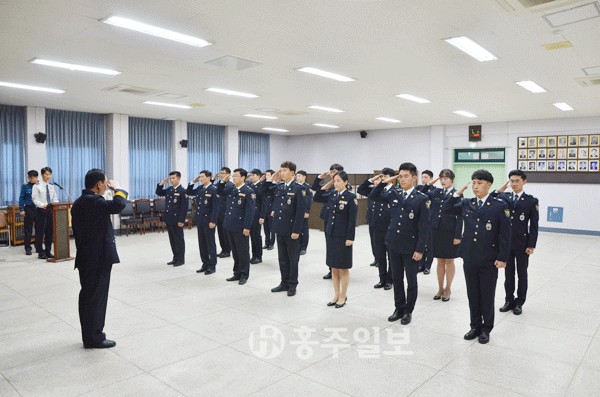 홍성경찰서(서장 구재성)는 지난 2일 경찰서 3층 대회의실에서 전보 및 전입 인사발령에 따른 신고식을 개최했다.<사진> 이에 따라 지역경찰 경위 김기상 등 7명과 신임 287기 순경 김진원 등 12명에 대한 인사발령을 실시했다. 이날 신고식은 홍북파출소 증원 및 신임경찰관 발령에 따른 교류인사로 각 대상자 별 전문성과 희망지등을 고려하여 배치했다는 설명이다.