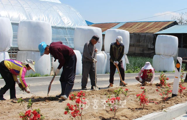 【구항】구항면 공리마을은 2016 희망마을에 선정돼 지난 19일 마을 꽃길을 조성했다. 이날 김기섭 이장을 비롯한 공리마을 주민들 50명이 꽃길 조성에 참여했다. 주민들은 공리마을 안쪽 길 2km구간에 산딸나무, 앵두나무, 왕벗, 반송, 화살나무, 아로니아, 꽃단지, 백합, 초롱꽃, 패랭이, 돌단풍 등을 한마음으로 심었다. 거동이 어려운 김영환(94) 어르신은 길 옆에 의자를 놓고 앉아 마음으로 함께 일했다.