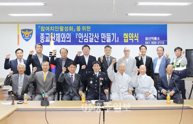 【갈산】 홍성경찰서(서장 구재성) 갈산파출소는 지난달 28일 갈산면사무소 회의실에서 장기욱 갈산파출소장, 김종래 갈산부면장, 이상구 갈산농협 조합장, 나영광 갈산초등학교장, 전종현 갈산중고등학교장, 종교단체 대표자, 지역경찰 총 30명이 참석한 가운데 ‘안심갈산’ 만들기 협약식 행사를 가졌다.