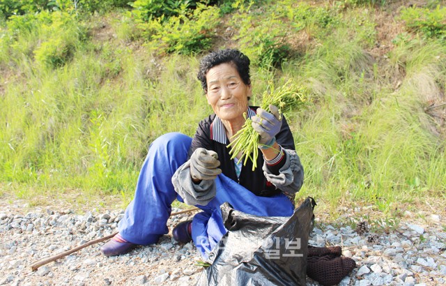 ▲ 집 근처에서 직접 뜯은 고사리를 들고 있는 이준선 할머니.