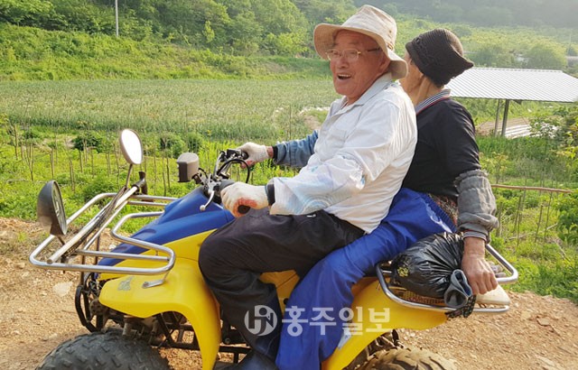 ▲ 고사리를 뜯고 할아버지 4륜 오토바이 뒤에 타고 집에 가고 있는 이준선 할머니.